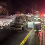The fire was reported at 6:42 p.m. between William Street Road and Carlos Lane, officials said, and when firefighters with the Indian River Volunteer Fire Company arrived, the vehicle was fully involved in flames.